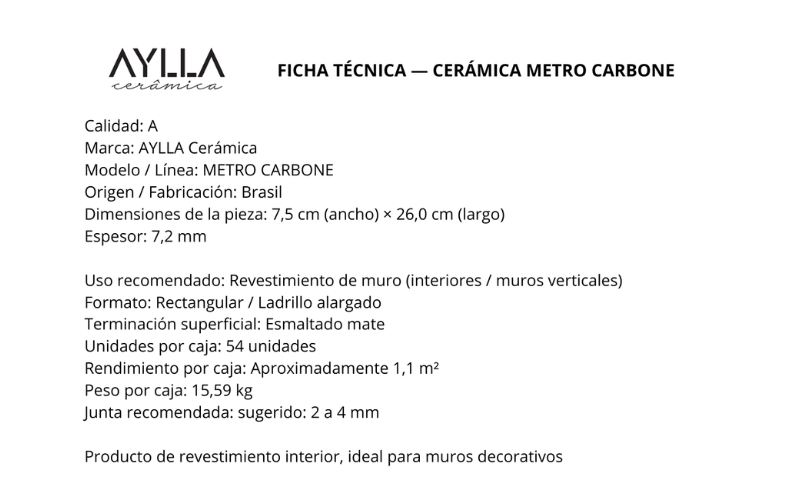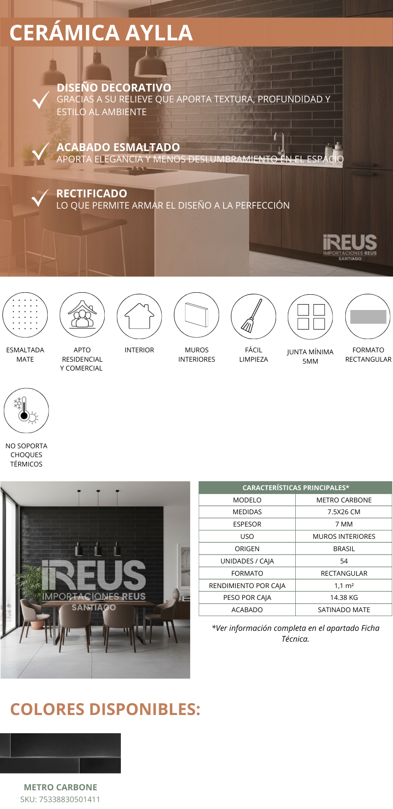 Cerámica 7.5x26cm $11.990xm² - METRO CARBONE Stock por sucursal Stock por sucursal $ 13.189 cantidad Agregar al carro Encargar Imágenes referenciales: los colores pueden variar según la configuración de cada pantalla.