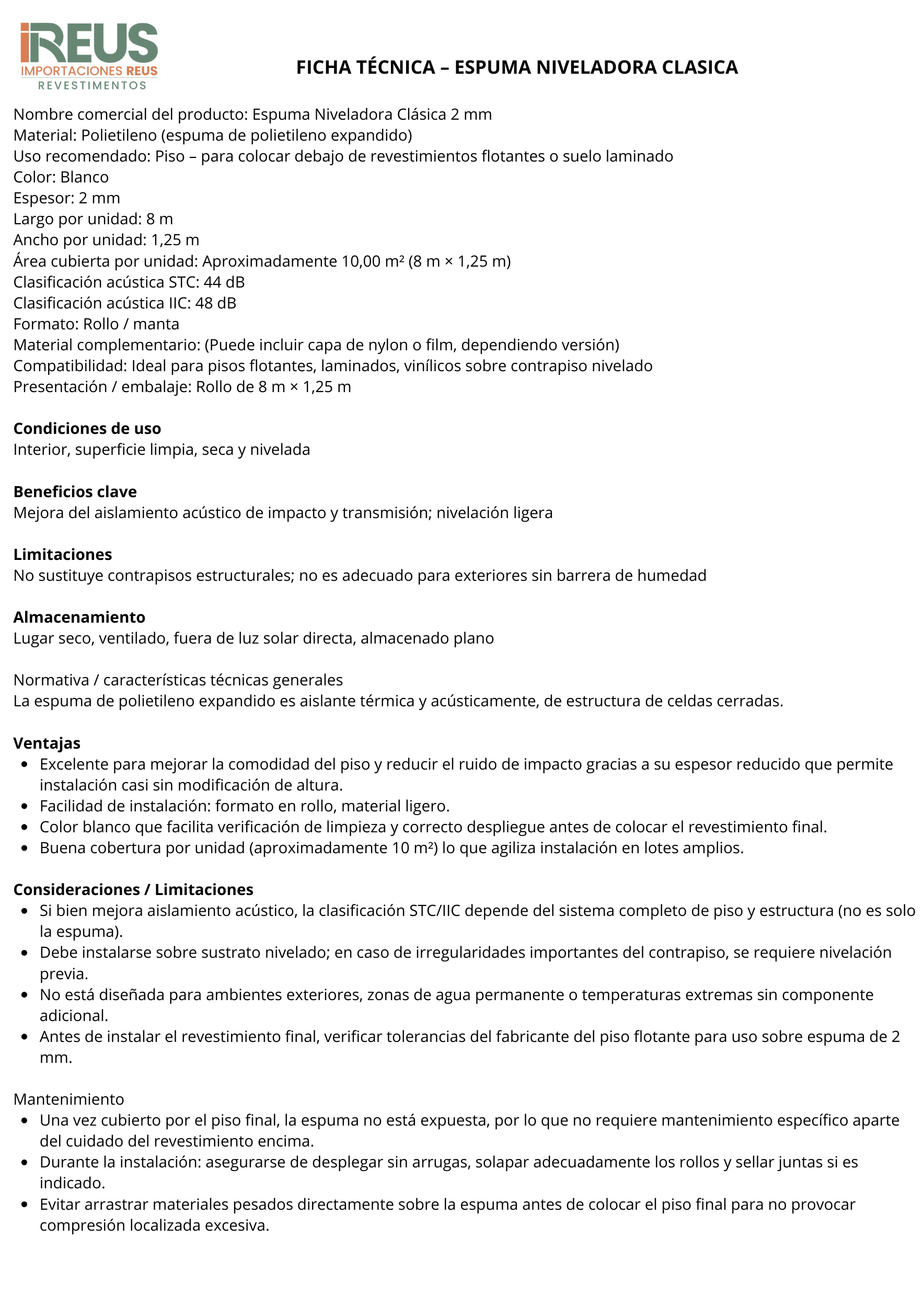 Espumas niveladoras de 2 mm. que permiten corregir las imperfecciones del piso anterior.