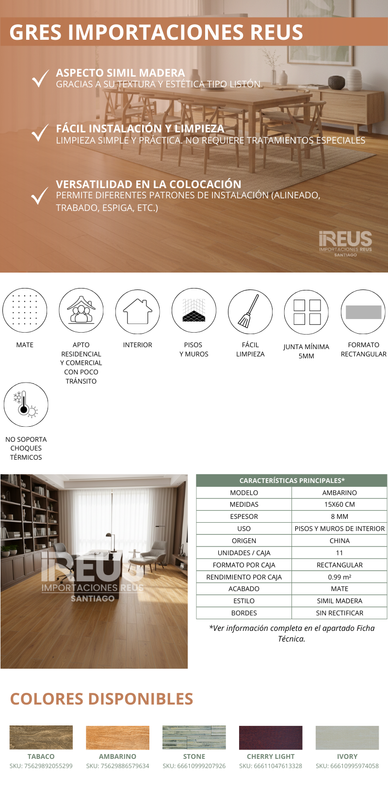 GRES 15x60cm $8.990xm² - Ambarino Stock por sucursal Stock por sucursal $ 8.900 cantidad Agregar al carro Encargar Imágenes referenciales: los colores pueden variar según la configuración de cada pantalla.