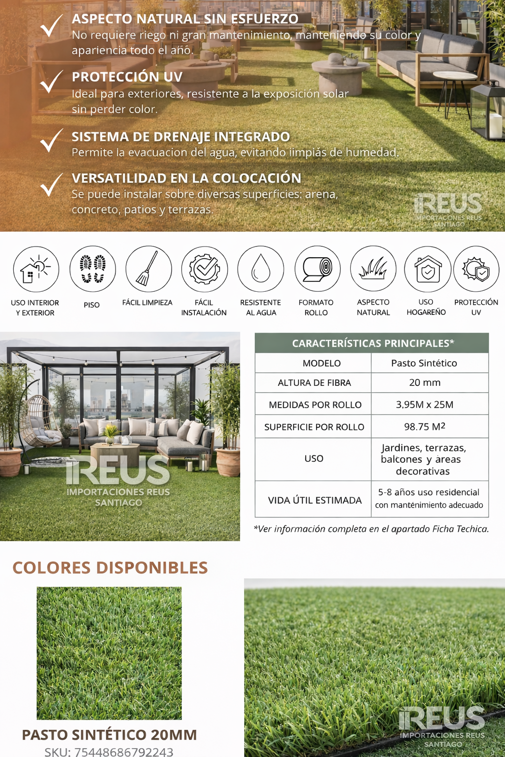 Pasto Sintético Decorativo 20mm $3.990xm² 3colores (3.95m/de ancho)