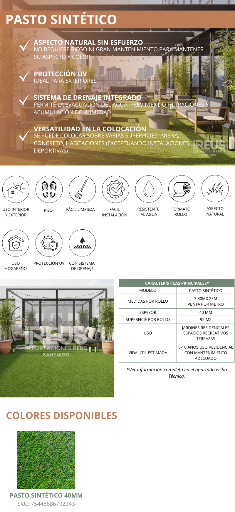 Pasto Sintético decorativo 40mm $5.942xm² 4colores (3.8m/de ancho)
