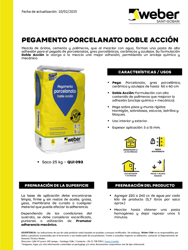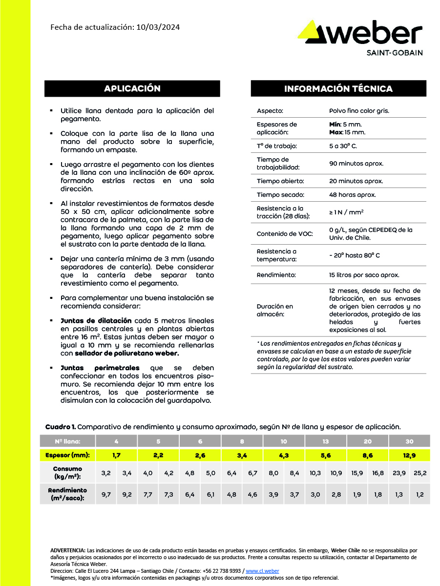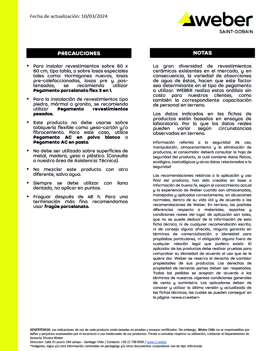 Polvo que al mezclar con agua forma un pegamento para el pegado de azulejos, cerámicas y porcelanatos de hasta 60x60 centímetros sobre pisos y muros rígidos interiores y exteriores.