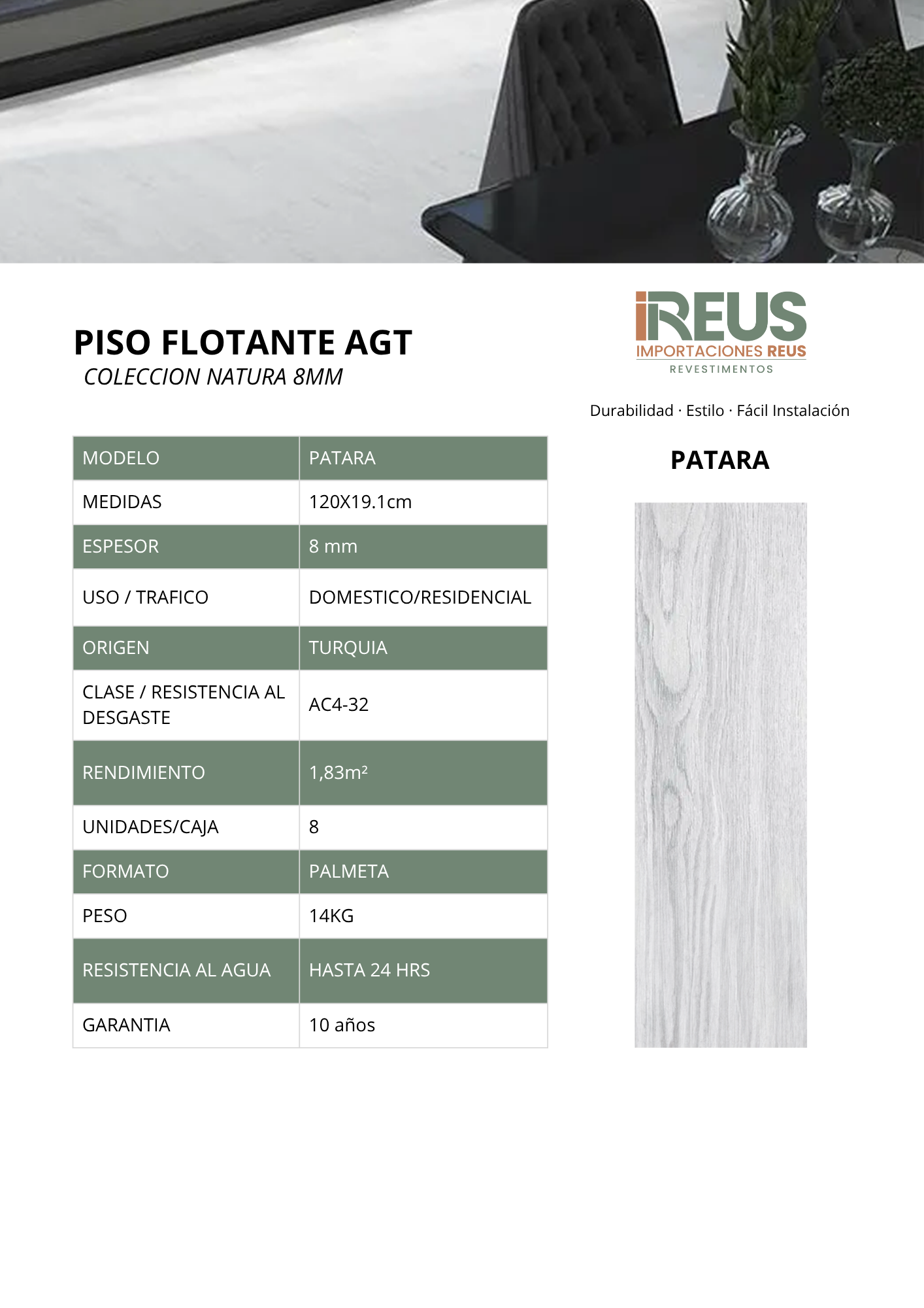 Piso Flotante 120x19.1cm $10.990 m² c/iva - Patara Stock por sucursal Stock por sucursal $ 20.112 Modelo Escoge Modelo Sin Biselado Formato Escoge Formato 19.1x120 Origen Escoge Origen Turquía Espesor Escoge Espesor 8 mm cantidad Agregar al carro Encargar * Las imágenes pueden variar dependiendo de la configuración de cada pantalla.