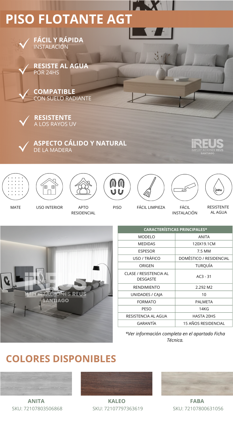 Piso Flotante 120x19.1cm $7.986 xm² c/iva - Anita Stock por sucursal Stock por sucursal $ 18.305 cantidad Agregar al carro Encargar Imágenes referenciales: los colores pueden variar según la configuración de cada pantalla.