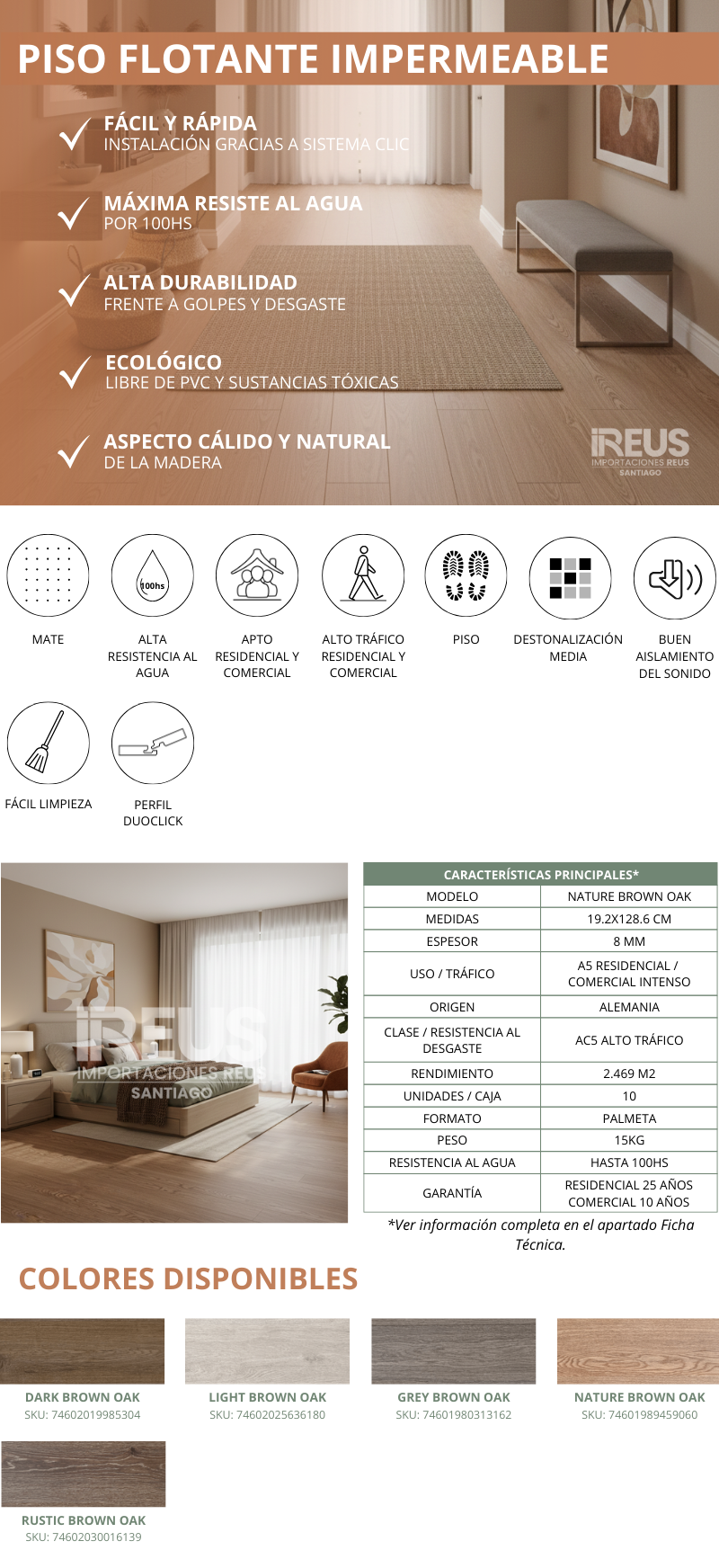 Piso Flotante Impermeable 19.2x128.6cm $15.490xm²- NATURE BROWN OAK