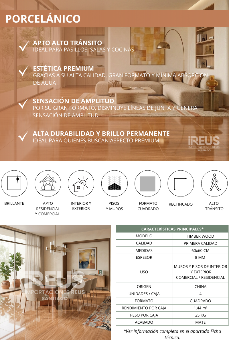 PORCELÁNICO BRILLANTE 60x60 $8.990xm² - TIMBER WOOD Stock por sucursal Stock por sucursal $ 12.946 cantidad Agregar al carro Encargar Imágenes referenciales: los colores pueden variar según la configuración de cada pantalla.
