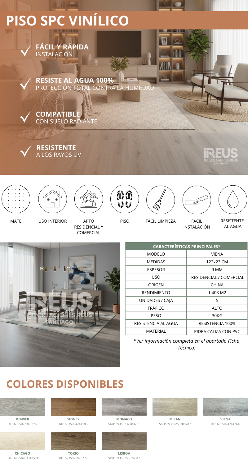 SPC Piso Vinílico 9mm 122x23cm $22.650xm² c/iva - Viena Stock por sucursal Stock por sucursal $ 31.778 cantidad Agregar al carro Encargar Imágenes referenciales: los colores pueden variar según la configuración de cada pantalla.
