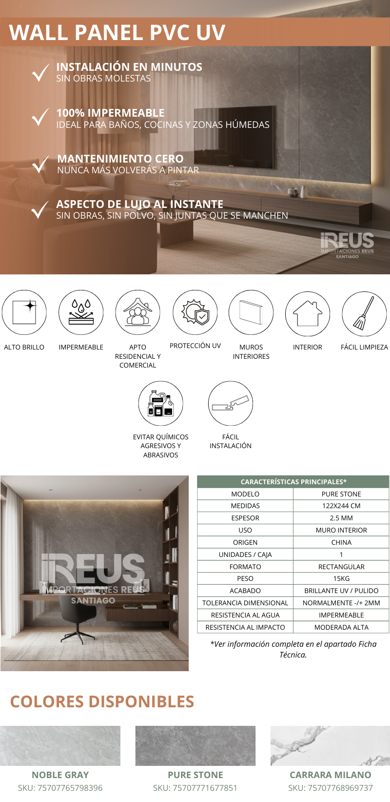 Wall Panel PVC UV 1220X2440mm - Pure Stone $5.373xm² Stock por sucursal Stock por sucursal $ 15.990 cantidad Agregar al carro Encargar Imágenes referenciales: los colores pueden variar según la configuración de cada pantalla.